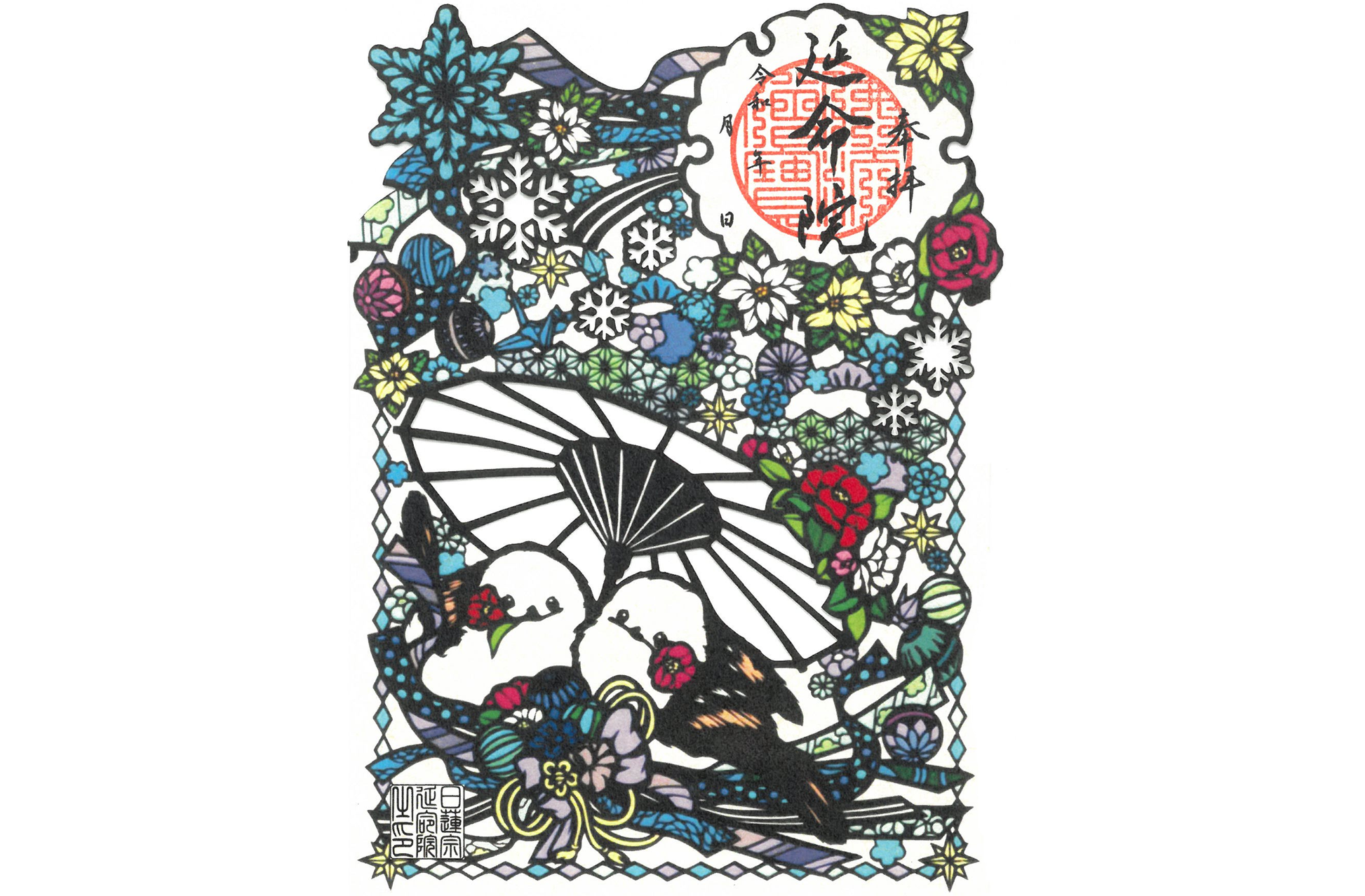 雪の妖精」の愛らしい姿と、寒さの中で凛と咲く椿の花が彩る、冬の情景を切り絵御朱印にいたしました。